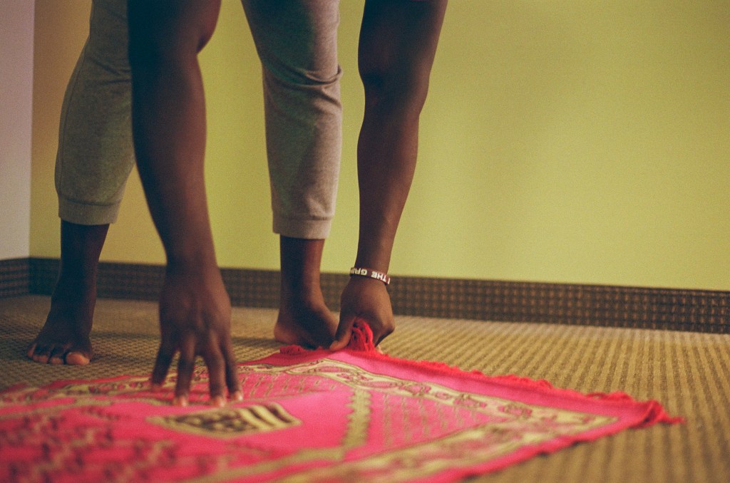 Kouyate reaches under his nightstand to grab his black prayer beads and his pink prayer mat. He places the pink prayer mat in the corner of the room—facing the holy city of Mecca, where the Kaaba is located. The Kaaba serves as the most sacred site in Islam and is where Muslims aspire to make pilgrimage one day. This pilgrimage is only one of the Five Pillars of Islam which are Shahada, Salat, Zakat, Sawm, and Hajj. Shahada is the belief that Allah is the one and only God. Salah is the five required daily prayers. Zakat deals with charity and donating 2% of yearly savings to the poor. Sawm is fasting during Ramadan. And Hajj which is the pilgrimage to Mecca.