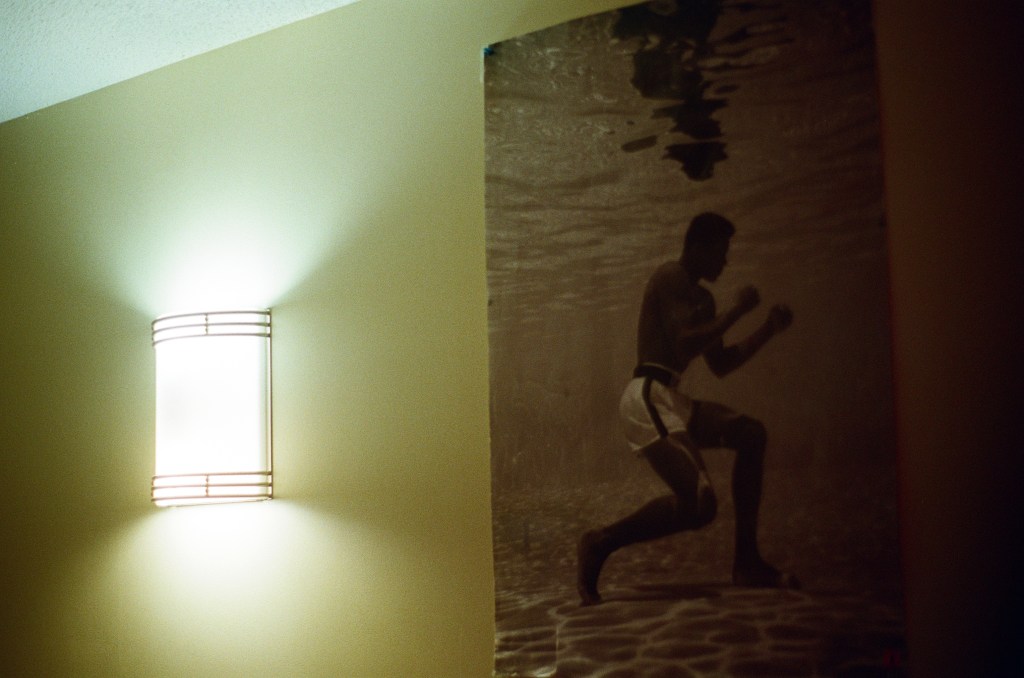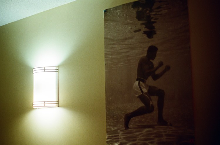 The LED lights that try to illuminate Kouyate’s room are overshadowed by posters of Muhammad Ali and Tupac Shakur. Above Kouyate’s bed frame, a black and white poster of Muhammad Ali flexing over Sonny Liston hangs. Across the room, a poster of Ali underwater in his fighting stance greets his guest.